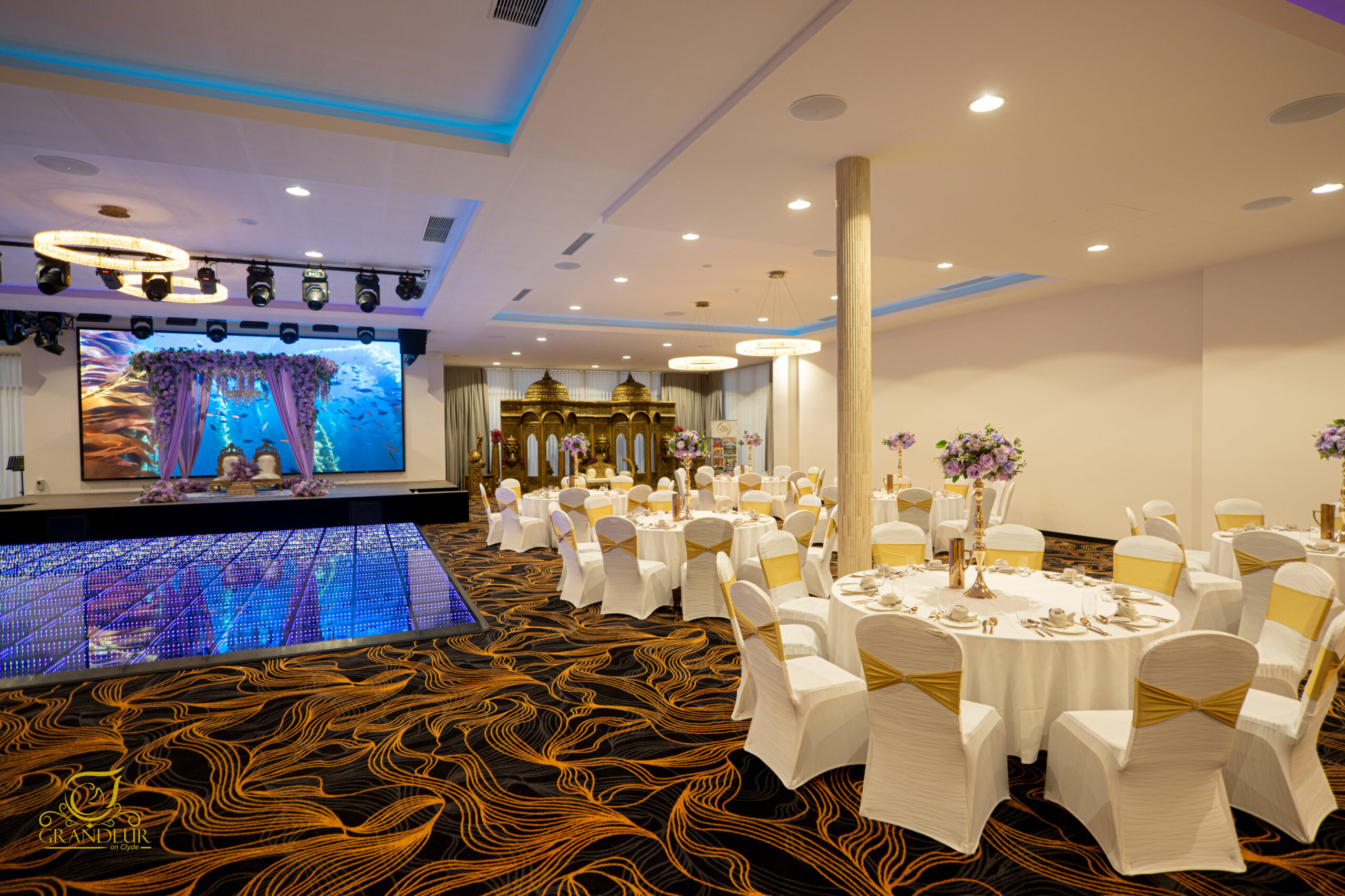 From the moment your guests arrive, they are welcomed into a foyer crowned with a dazzling chandelier and accented by mirrored finishes. Inside, the grand hall inspires awe with a giant LED screen, a luminous LED dance floor, and a fully balanced BOSE ceiling sound system, creating an unforgettable atmosphere.